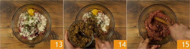 Adicione então o ovo 13, o pão espremido 14 e uma pitada de sal, misture tudo até formar uma massa homogênea 15.