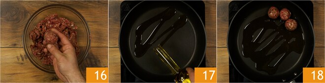 Forme almôndegas de cerca de 30 g cada 16, serão cerca de 30. Aqueça um fio de óleo em uma frigideira 17, doure as almôndegas 18.