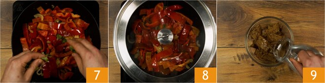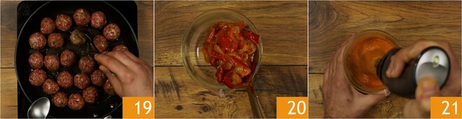 Vire-as quando estiverem douradas 19 e continue até completar o cozimento, levará cerca de 5-6 minutos. Quando estiverem todas prontas, coloque os pimentões no copo de um mixer 20, bata com o mixer de imersão até obter um creme 21.