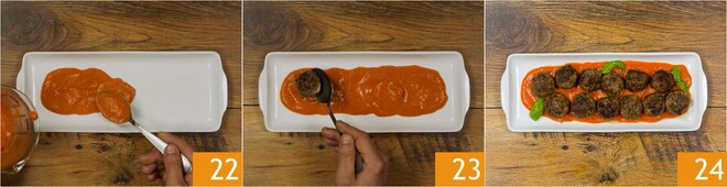 Em uma travessa, coloque o molho de pimentões 22 e sobre ele disponha as almôndegas 24. Sirva imediatamente as almôndegas ao molho de pimentões.