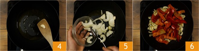 Em uma frigideira, coloque um fio de azeite de oliva extra virgem, refogue um dente de alho 4 e, assim que começar a dourar, adicione primeiro as cebolas 5, que você deixará refogar por alguns minutos, depois adicione também os pimentões 6.