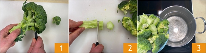 Para preparar as almôndegas de brócolis fritos, comece limpando os brócolis: separe os floretes 1, depois descasque o caule e corte-o em pedaços 2. Coloque tudo em água fervente 3.<\/p>
