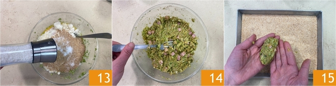 Adicione sal 13 e misture para obter um composto homogêneo 14. Pegue uma porção de massa de cerca de 80 g e forme uma almôndega oval 15, depois passe na farinha de rosca.<\/p>