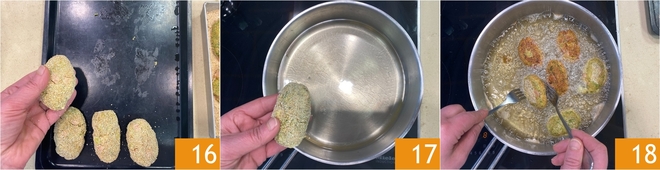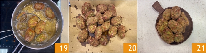 À medida que forma as almôndegas, coloque-as em uma bandeja; com estas quantidades, você obterá cerca de 16 16. Aqueça o óleo em uma panela e, quando atingir 170°C, mergulhe as almôndegas 17. Frite por cerca de 5-7 minutos, virando as almôndegas durante a fritura 18.<\/p>