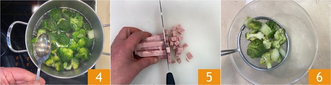 Adicione uma colher de chá de vinagre e cozinhe por cerca de 7-8 minutos 4. Enquanto isso, corte o presunto em cubos de cerca de meio centímetro 5. Uma vez cozidos os brócolis, escorra-os em uma tigela 6.<\/p>