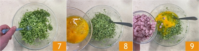 Amasse-os com um garfo 7, depois incorpore os ovos 8 e os cubos de presunto 9.<\/p>