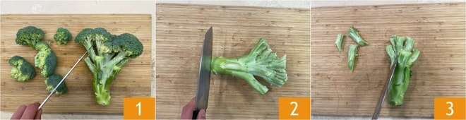 Para preparar as almôndegas de brócolis na fritadeira sem óleo, a primeira coisa a fazer é separar as flores do talo 1. O talo será usado para preparar imediatamente o molho para suas almôndegas, da seguinte forma: remova a base do talo e, em seguida, separe todos os ramos 3.