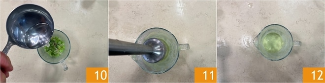 Adicione também uma concha da água de cozimento 10 e bata com o mixer de imersão 11 até obter um molho suave 12. Transfira para uma tigelinha e reserve.