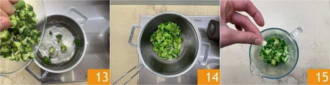 Leve a água onde você cozinhou os talos de volta à fervura e mergulhe também as flores 13. Cozinhe por cerca de 4-5 minutos, depois escorra-as 14. Transfira-as para o copo de um mixer e adicione um pedacinho de alho (cerca de 1/3 de um dente) 15.
