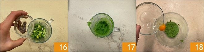 Adicione também as anchovas 16 e bata tudo com um mixer de imersão até obter um creme suave 17. Transfira a mistura para uma tigela e adicione um ovo 18.