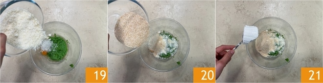 Adicione o Grana Padano DOP ralado 19, a farinha de rosca 20, sal, pimenta e a ricota 21.