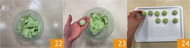 Amassar até obter uma mistura homogênea 22, depois forme pequenas almôndegas com as mãos, com cerca de 20 cm de diâmetro 23, e coloque-as em uma bandeja forrada com papel manteiga 24.