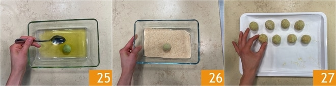 Despeje em uma assadeira um pouco de óleo e, em outra, um pouco de farinha de rosca. Agora empane as almôndegas, primeiro passando no óleo 25 e depois na farinha de rosca 26. Coloque-as em uma bandeja forrada com papel manteiga 27.
