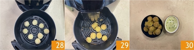 Prossiga com o cozimento (nós usamos uma fritadeira com capacidade de 6 litros). Pré-aqueça a fritadeira por um minuto, depois coloque cerca de 15 almôndegas na cesta e cozinhe a 180°C por 15-20 minutos 28 até que fiquem bem douradas 29. Continue cozinhando as outras e sirva as almôndegas junto com o molho preparado antes 30!