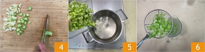 Corte-os em pedaços. Descasque o talo para remover a parte externa, que é mais dura. Em seguida, corte também o coração do talo em pedaços 4. Escalde tudo em água fervente salgada a gosto 5 por cerca de 5 minutos. Quando estiverem macios, escorra usando uma escumadeira e transfira-os para o copo de um mixer 6. Não descarte a água, ela será usada para cozinhar as flores.