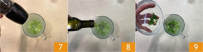 Adicione sal, pimenta 7, um fio de azeite 8 e algumas folhas de manjerona 9.