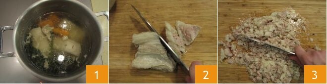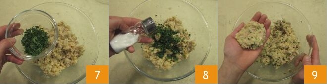 Pique finamente a salsinha e adicione à massa 7. Salgue a massa obtida 8 e trabalhe-a com as mãos. Pegue cerca de 30 g de massa, estenda delicadamente na palma da mão 9