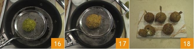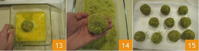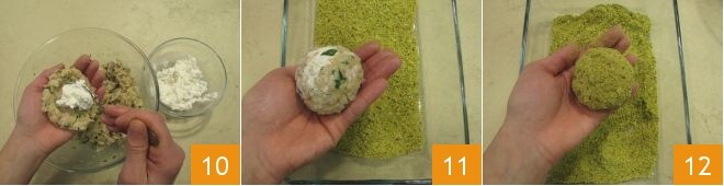e coloque cerca de 10 g de ricota de ovelha no centro 10. Feche a almôndega, dando-lhe uma forma redonda e certificando-se de que o recheio esteja bem selado dentro 11: com essas quantidades você obterá cerca de 15 almôndegas. Agora coloque em uma tigela a farinha de pistache e em outra bata os ovos; passe cada almôndega primeiro na farinha de pistache 12,