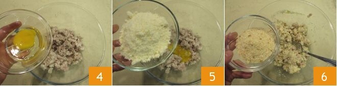 Transfira o picado para uma tigela e adicione o ovo 4, o parmesão 5, a farinha de rosca 6 e misture tudo muito bem.