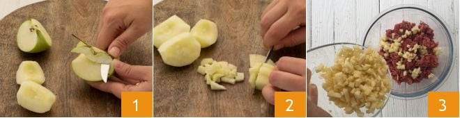 Para preparar as almôndegas de carne e maçã, primeiro descasque a maçã, corte-a em quartos, retire o miolo 1 e depois corte em cubos pequenos 2. Em uma tigela, coloque a carne moída, adicione a maçã 3,