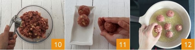 e por fim adicione também o dente de alho picado 10, que você pode omitir, a critério. Agora pegue pequenas porções de massa com as mãos úmidas e forme bolinhas do tamanho de uma noz 11. Com as quantidades indicadas, você obterá cerca de 20 almôndegas. Agora coloque o óleo em uma frigideira, aqueça e frite as almôndegas 12 por cerca de 3 minutos.