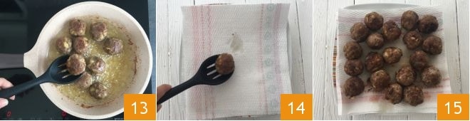 Quando estiverem bem douradas 13, escorra e coloque sobre uma bandeja forrada com papel absorvente para secar o excesso de óleo 14. Sirva as almôndegas de carne e maçã bem quentes 15.