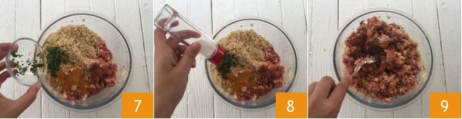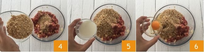 e em seguida o restante dos ingredientes: o pão ralado 4, o leite 5, o ovo inteiro 6