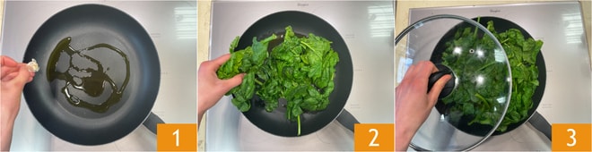 Para preparar as almôndegas de espinafre, aqueça uma panela, adicione um fio de óleo e um dente de alho inteiro 1. Deixe aquecer levemente, em seguida adicione o espinafre limpo, cubra com uma tampa 3 e cozinhe por cerca de 3 minutos, ou até que fiquem macios.