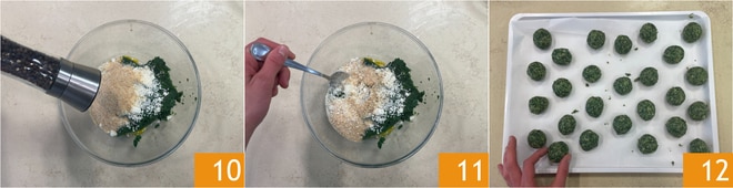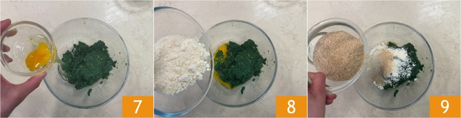 Depois de escorrer, coloque o espinafre em uma tigela, adicione o ovo 7, o Grana Padano DOP ralado 8 e a farinha de rosca 9.
