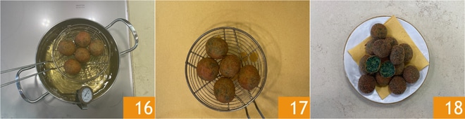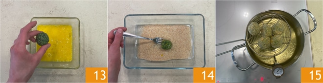 Agora empane as almôndegas passando primeiro no ovo batido 13 e depois na farinha de rosca 14. Frite poucas almôndegas por vez em óleo quente a 170°C (medido com termômetro de cozinha) por cerca de 3 minutos 15.