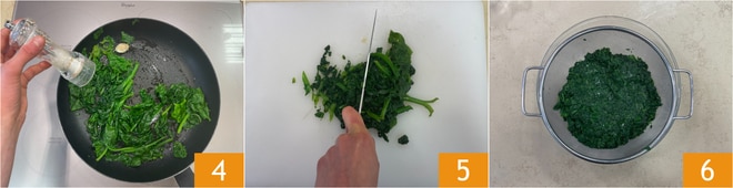 Retire a tampa, deixe o espinafre secar o líquido de cozimento por cerca de 1 minuto e adicione sal. Deixe o espinafre esfriar um pouco e pique com uma faca 5, coloque para escorrer em uma peneira, pressionando com uma colher.