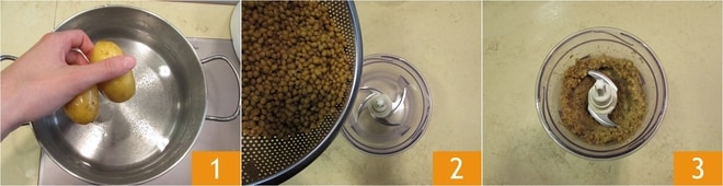 Para preparar as almôndegas de lentilhas e batatas ao molho, primeiro coloque as batatas para ferver 1. Vai levar cerca de 30-40 minutos, dependendo do tamanho delas. Quando as batatas estiverem quase cozidas, coloque as lentilhas já escorridas no recipiente de um mixer 2 e triture até obter um creme 3.