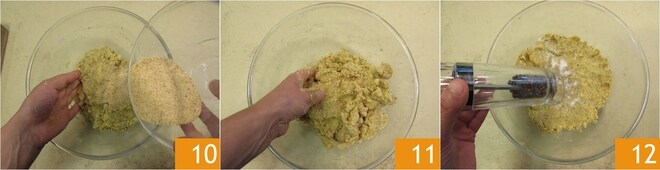 Agora adicione a farinha de rosca 10 e misture 11. No final, ajuste o sal e a pimenta 12.