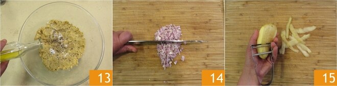 e um fio de azeite 13. Misture tudo e reserve, enquanto isso, prepare o molho. Pique finamente a cebola 14 e descasque as batatas 15.