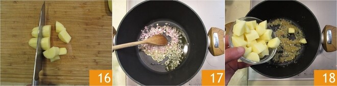 Corte em cubos grandes de 2-3 cm 16. Agora coloque um fio de azeite em uma panela e refogue a cebola por 7-8 minutos em fogo médio. Quando estiver bem refogada, adicione também as batatas 18.