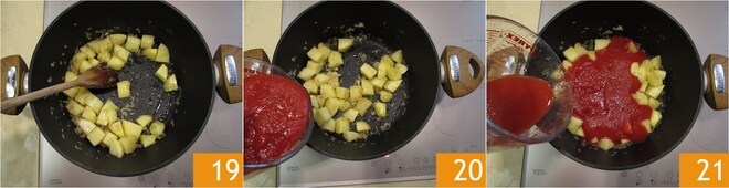 Doure as batatas por 2 minutos 19 e adicione o purê de tomate 20. Em seguida, adicione um pouco de água para diluir o molho 21.