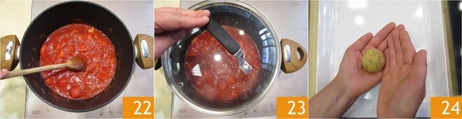 Salpique, apimente e misture bem 22. Cubra com uma tampa e deixe cozinhar por 40 minutos, mexendo de vez em quando. Enquanto isso forme as almôndegas usando cerca de 30 g de massa e dando uma forma arredondada 24.