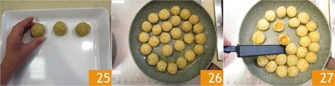 Continue dessa forma até formar todas, colocando-as gradualmente em uma bandeja 25. Você obterá cerca de 25. Depois de terminar de preparar as almôndegas, pegue uma frigideira antiaderente, adicione um fio de azeite e aqueça no fogo. Coloque as almôndegas dentro e cozinhe por 4-5 minutos. Usando uma espátula, vire-as delicadamente 27.