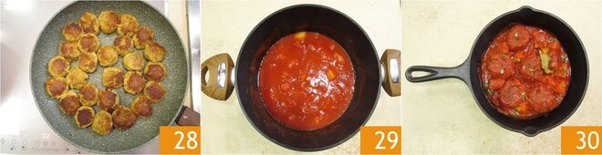 Cozinhe por mais 5 minutos, até que fiquem bem douradas em ambos os lados 28. Assim que o molho estiver pronto 29, despeje-o sobre as almôndegas e sirva 30.