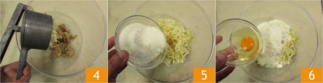 Transfira-as para uma tigela grande e, quando estiverem cozidas, amasse as batatas dentro 4. Adicione o Grana Padano DOP ralado 5 e o ovo 6.