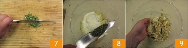 Pique então o alecrim 7 e adicione na tigela 8. Misture tudo com as mãos 9.