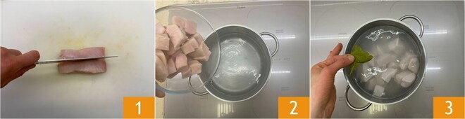 Para preparar as almôndegas de peixe-espada ao molho, a primeira coisa a fazer é cortar o filé de peixe-espada, já sem espinhas e pele, em cubos 1. Mergulhe-o em água fervente ligeiramente salgada 2 junto com as folhas de louro 3.