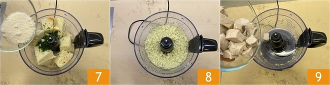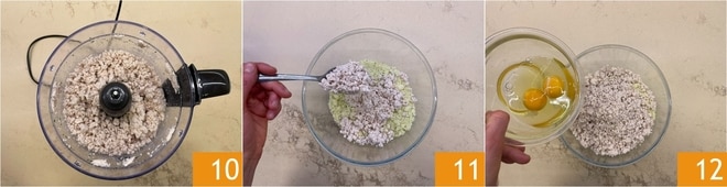 Adicione também o Grana Padano DOP ralado 7, uma pitada de sal e triture tudo até obter migalhas 8. Transfira depois para uma tigela grande e coloque o peixe-espada no mixer 9, sem lavá-lo.