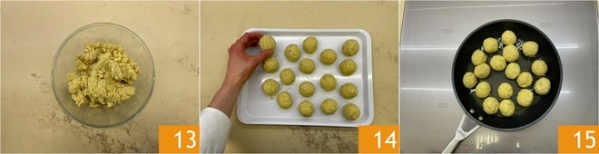 Misture bem até obter uma massa homogênea 13. Forme cerca de 17 almôndegas pegando uma porção de massa e moldando em formato redondo 14. Aqueça uma frigideira com um fio de óleo e coloque as almôndegas dentro 15.