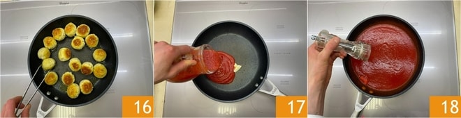 Doure bem todos os lados 16, depois transfira para um prato. Na mesma frigideira, adicione um dente de alho e o molho de tomate 17. Salgue e apimente 18. Deixe cozinhar por alguns minutos e, assim que começar a ferver, retire o dente de alho.
