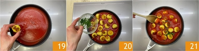 Mergulhe as almôndegas no molho 19, perfume com salsinha picada 20 e misture delicadamente 21.