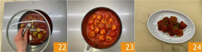 Cubra com uma tampa 22 e continue cozinhando por cerca de 20 minutos, mexendo de vez em quando. Assim que as almôndegas estiverem prontas 23, sirva e decore com salsinha picada. Sirva suas almôndegas de peixe-espada ao molho bem quentes 24!