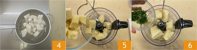 Cozinhe por 5 minutos, depois escorra 4. Corte o pão em pedaços e transfira-o para o mixer 5; adicione a salsinha picada 6 e o dente de alho.