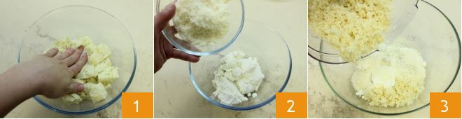Para preparar as almôndegas monstruosas, prepare o caldo de legumes necessário para as almôndegas e para o cozimento das batatas, depois dedique-se à massa: em uma tigela, coloque o miolo de pão de molho no leite 1, garantindo que seja completamente absorvido. Enquanto isso, em outra tigela, coloque a ricota, o queijo ralado 2, a noz-moscada ralada; adicione também o pão embebido ligeiramente espremido 3 e o ovo.