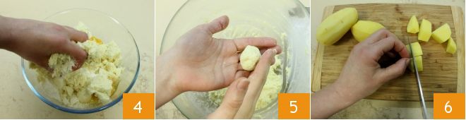 Sal a gosto e amasse com as mãos 4. Se a massa estiver muito mole, adicione 30 g de farinha de rosca. Molhe levemente as mãos para não grudar a mistura e forme 20 almôndegas de cerca de 20 g cada 5 e reserve. Continue o preparo começando pelo creme de batatas: descasque as batatas e corte em pedaços 6